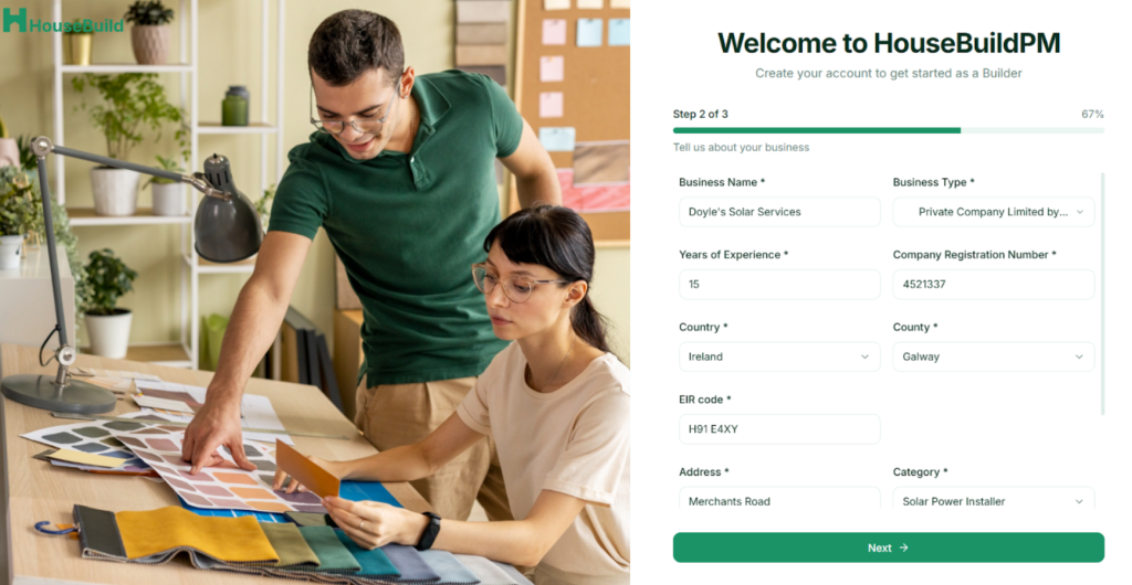 For users registering, the platform needs the submission of more specific information depending if creating a builder or client account. This includes comprehensive Business Details, such as the business name, organizational type, and accumulated years of experience.