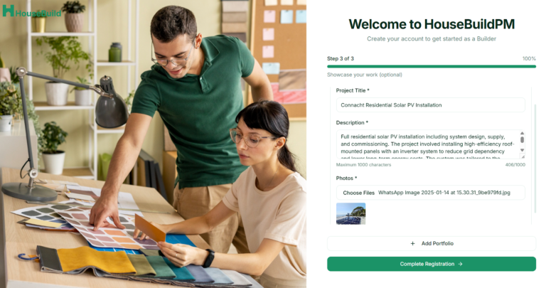 Step 3: Prior to finalizing registration, users are afforded the opportunity to enhance their professional profile by contributing to their Portfolio. This optional but highly recommended step involves uploading photographic evidence and detailed descriptions of previously completed projects. A well-curated portfolio serves as a potent instrument for Builders to effectively demonstrate their expertise and project capabilities directly to prospective clients within the HousebuildPM platform.