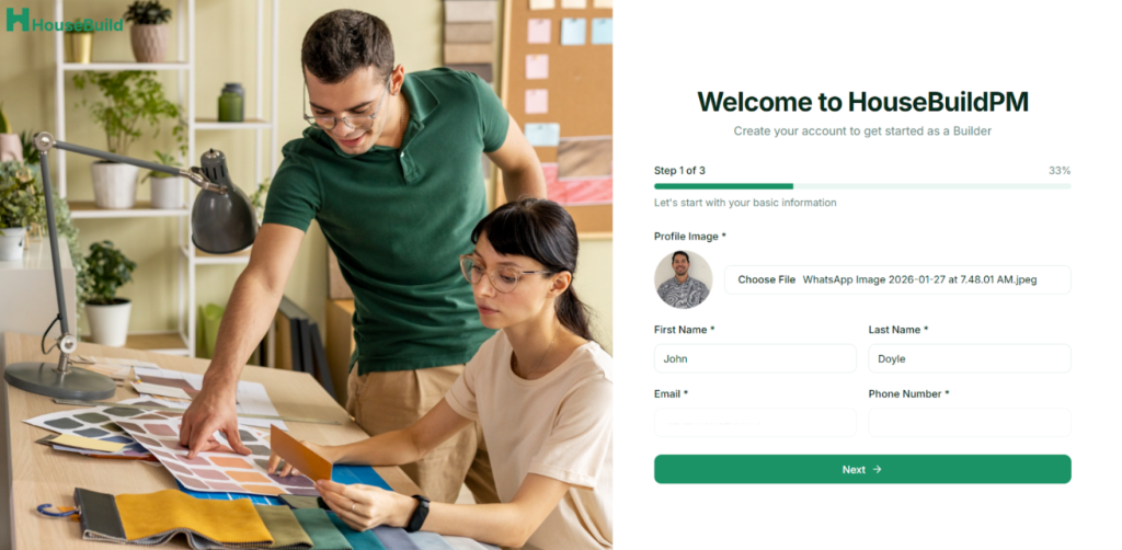 Upon navigating to the Housebuild PM website, users are prompted to initiate the registration process by clicking the Get Started button. This action leads to a pivotal choice, allowing prospective users to self-identify as either a Builder (intended for contractors, tradespeople, and construction firms) or a Client (designed for homeowners and developers seeking to monitor their construction projects). This initial selection tailors the subsequent registration steps to the user’s specific role within the construction ecosystem.
