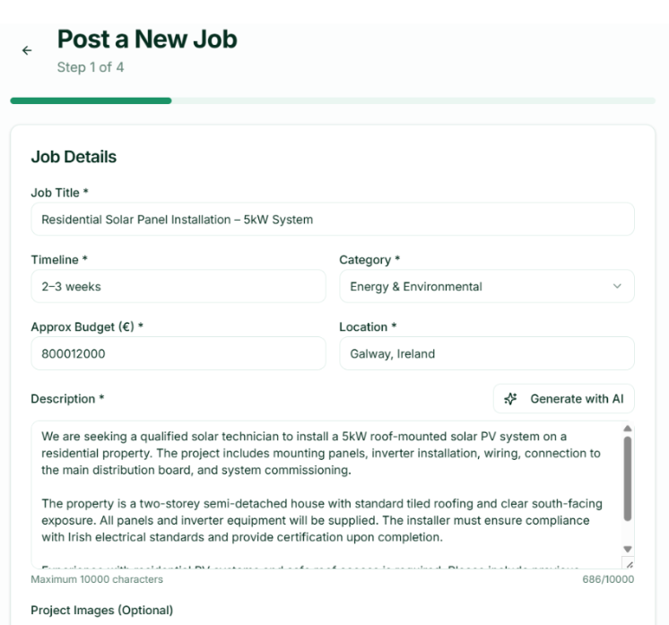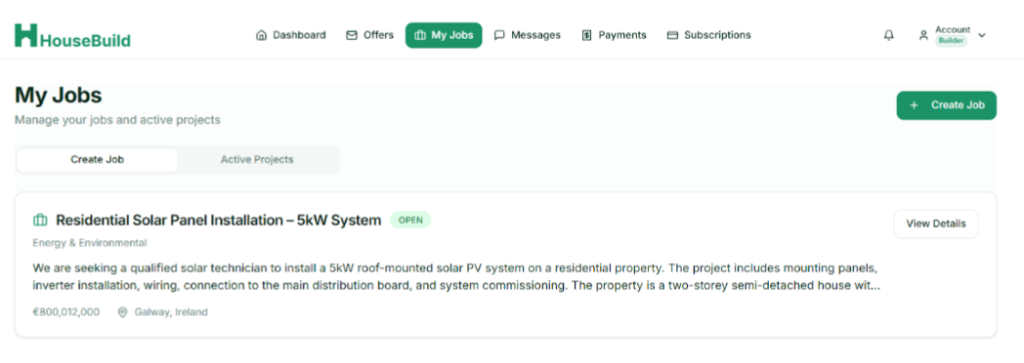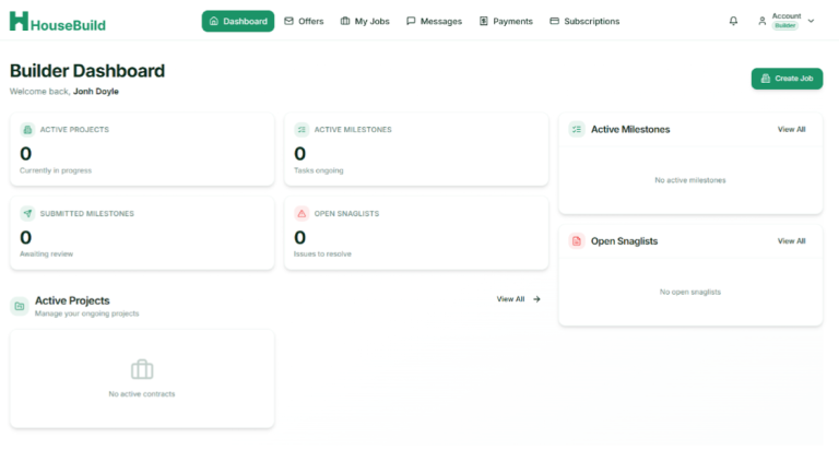 The My Jobs tab serves as the central hub within Housebuild PM, giving builders the tools expected from modern construction project management software. From this interface, users can initiate new projects by selecting Create a New Job, where they define the project’s scope, budget, and geographical location, users can Set Milestones, segmenting projects into distinct, manageable phases, thereby ensuring all stakeholders are cognizant of impending tasks and deadlines. Furthermore, the platform facilitates seamless Progress Tracking, allowing projects to transition from an “Open” to a “Completed” status upon the achievement of defined targets.