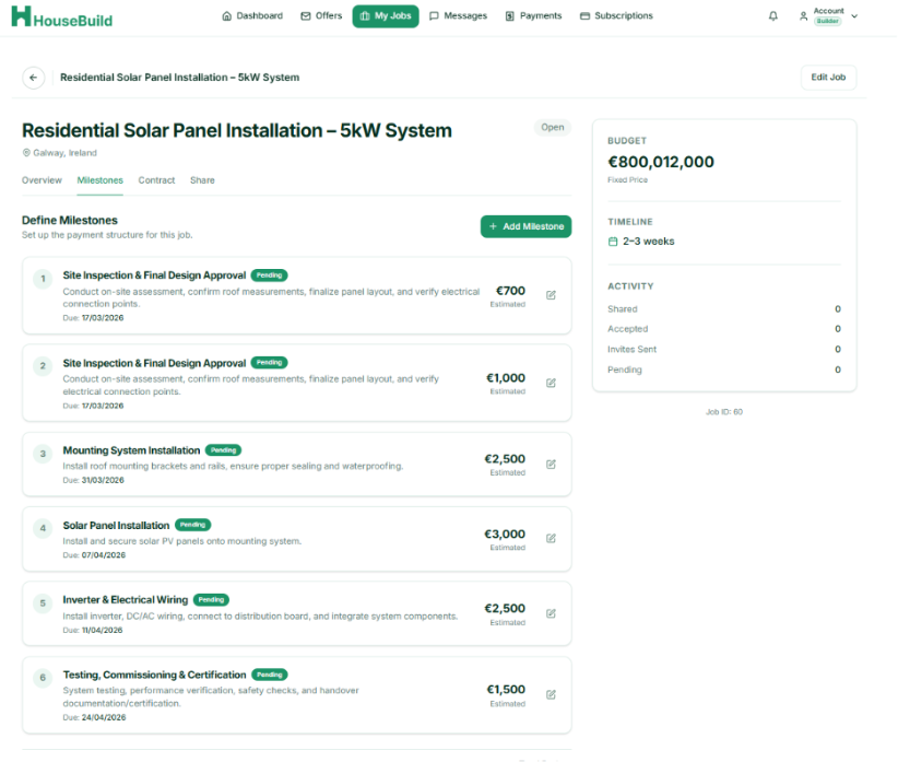 Milestones are the backbone of effective project management in Housebuild PM. By breaking your project into clear phases with associated deadlines and payment amounts, you create a transparent roadmap for both your team and your clients. This clarity reduces misunderstandings and accelerates project completion.
